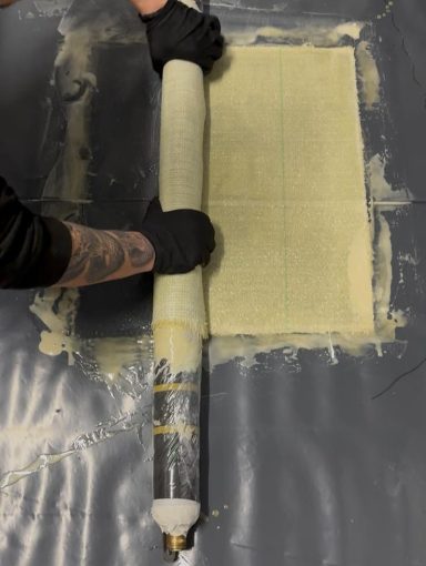 Das dritte Bild zeigt eine Glasfasermatte, die mit einem 3P-Harz gleichmäßig eingestrichen wird. Das Harz dient als Bindemittel und sorgt nach der Aushärtung für eine stabile und dichte Innenbeschichtung.
