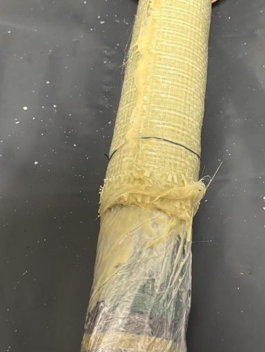 Im vierten Bild wird die zuvor mit 3P-Harz bestrichene Glasfasermatte sorgfältig und gleichmäßig um den folierten Packer gewickelt. Dadurch entsteht ein widerstandsfähiger Inliner, der später im Rohrinneren aushärtet.