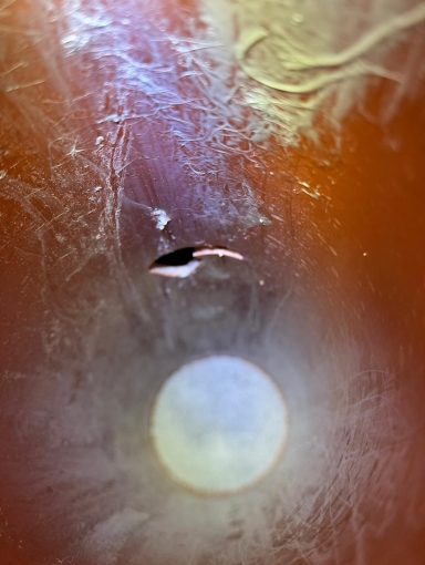 Das erste Bild zeigt die Innenansicht eines beschädigten Rohrs. In der Rohrwand ist ein deutlicher Riss bzw. ein Loch erkennbar.
